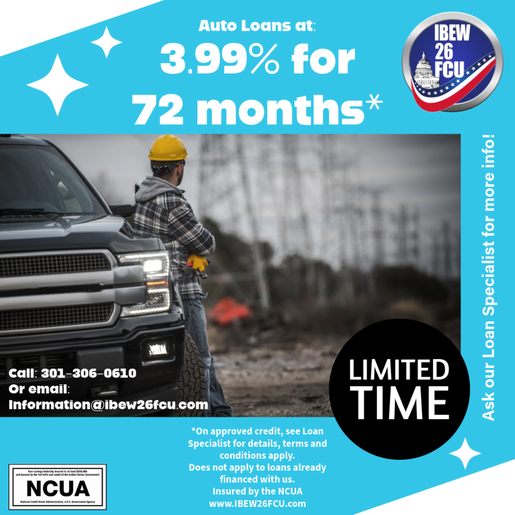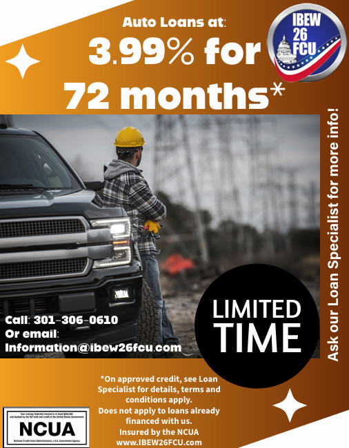 IBEW 26 FCU is committed to providing a website that is accessible to the possible audience in accordance with ADA standards and guidelines. We are actively working to increase accessibility and usability of our website to everyone. If you are using a screen reader or other auxiliary aid and are having problems using this website, please contact us at 301-306-0610 or information (at) ibew26fcu.com. All products and services available on this website are available at our branch.